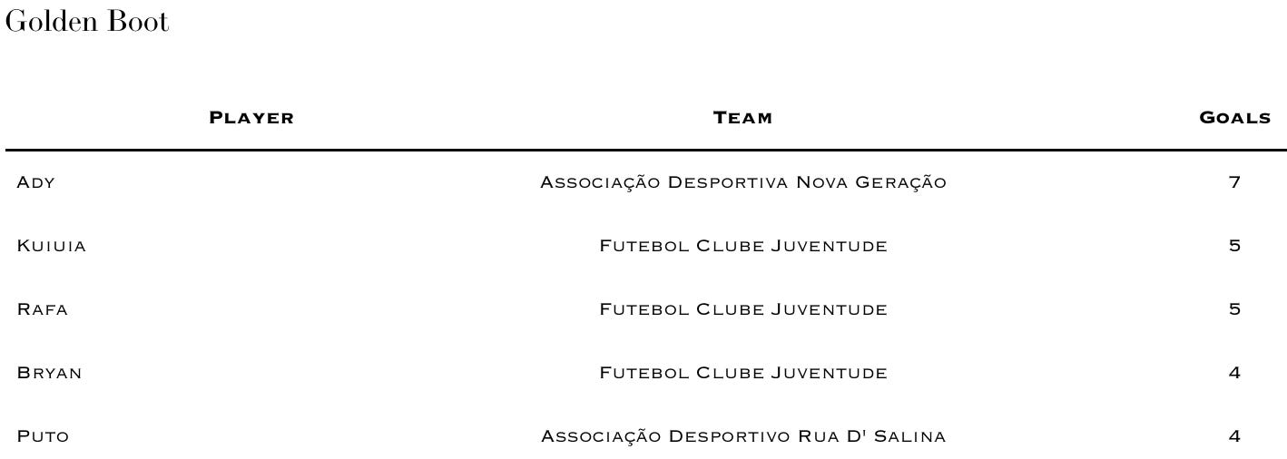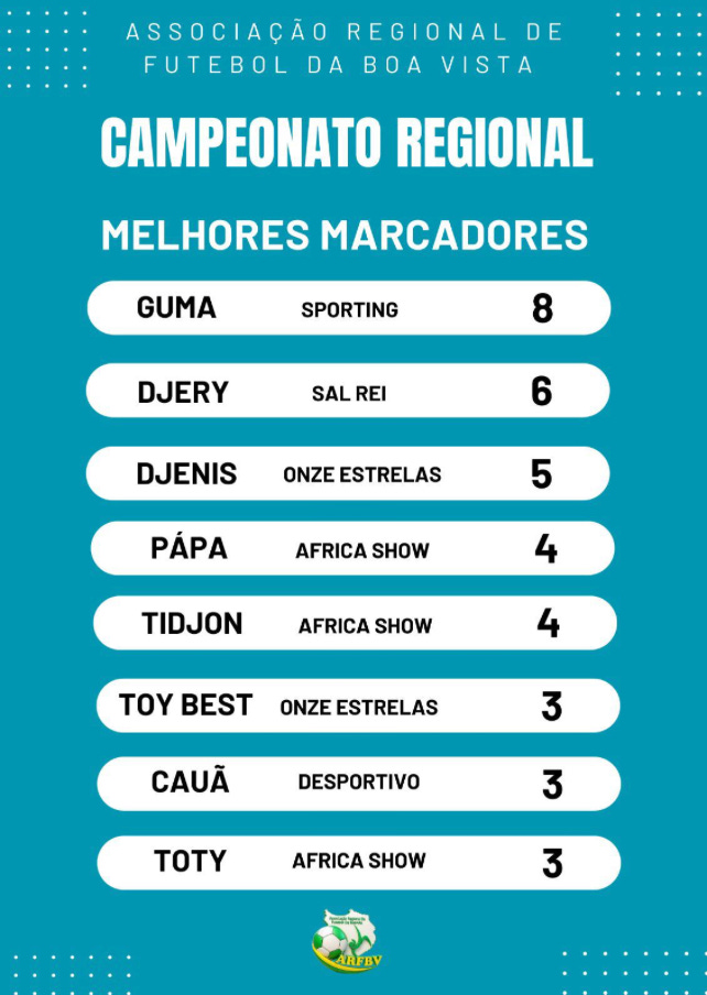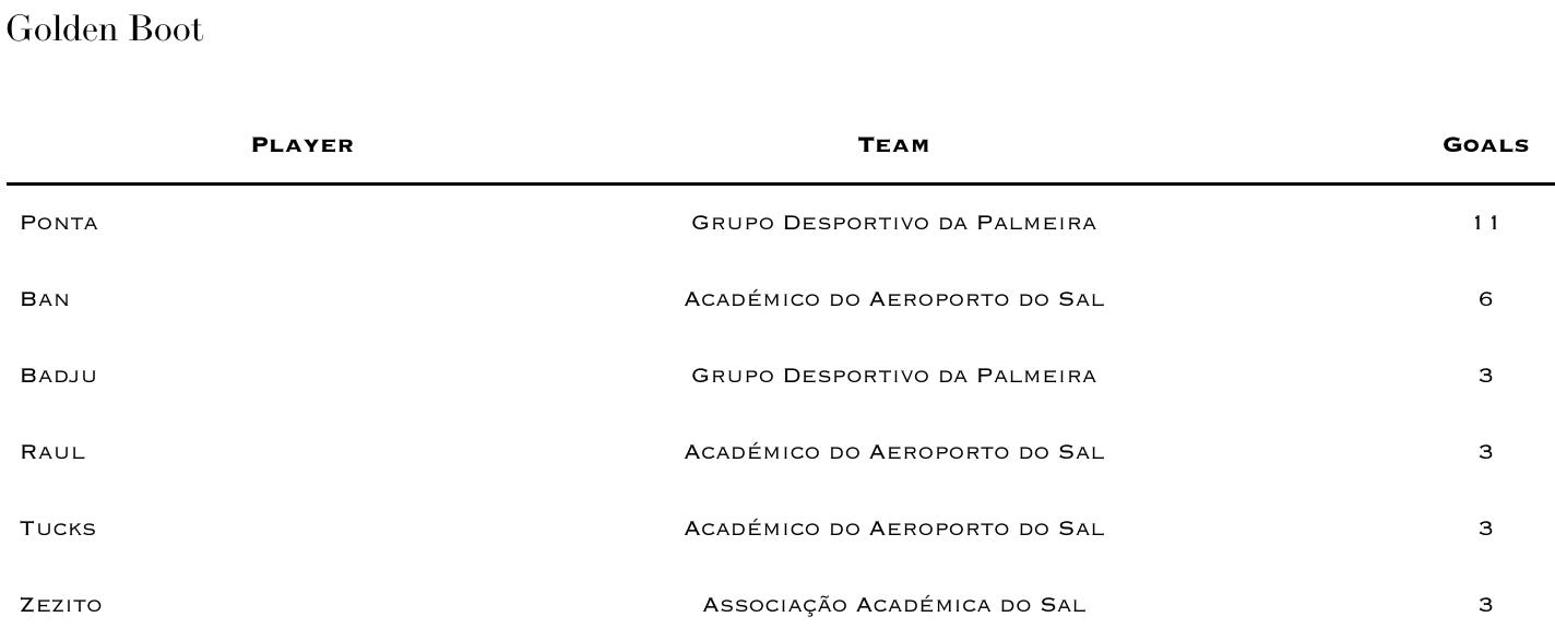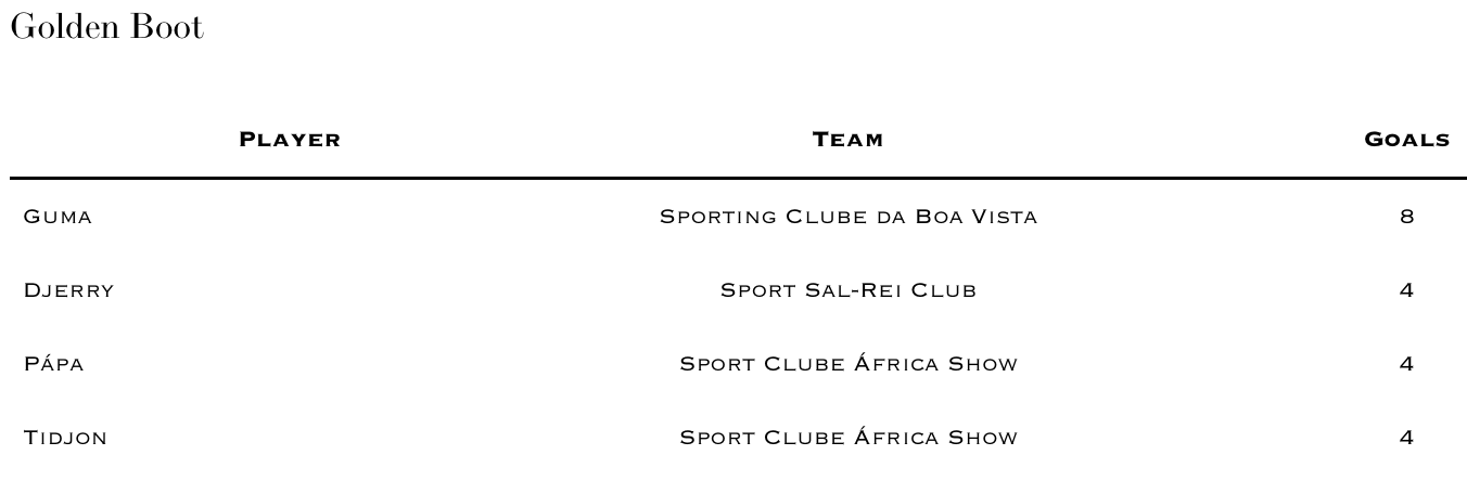Just a note that my data is missing some goal scorers as I have the following Golden Boot table which differs from that of the ARFBV (FA on the island of Boa Vista), whose data is far more reliable than mine but not completely public. One thing we both have shared is that Guma from Sporting da Boa Vista is crushing it.