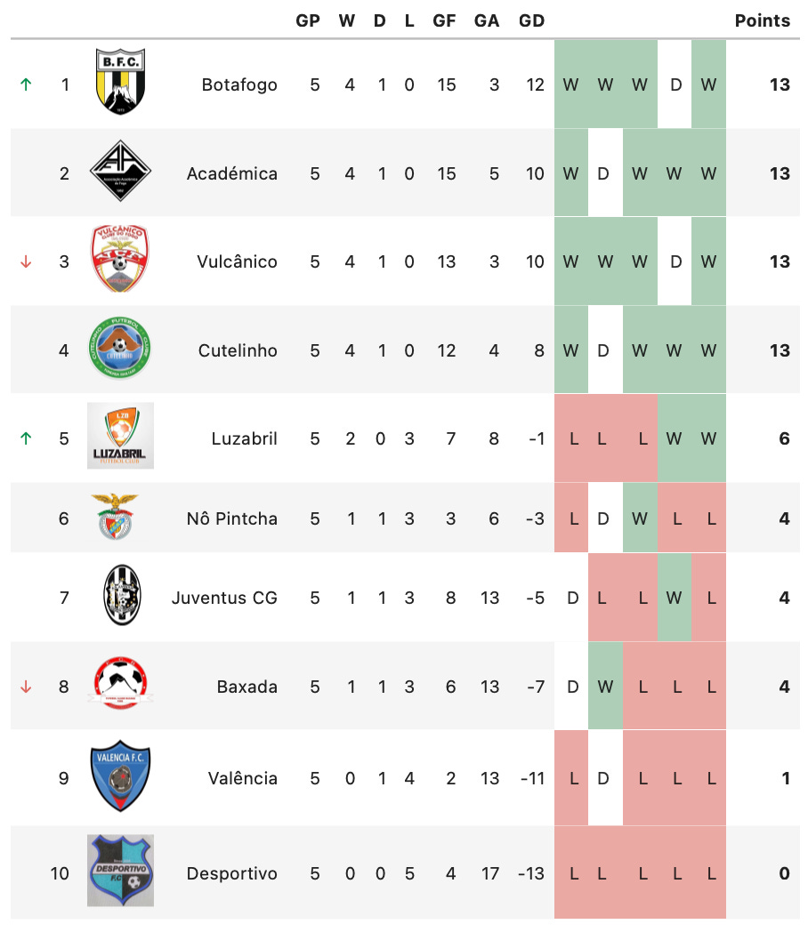 More games in the regional league with Botafogo proving dominant in a 6-0 rout of Baxada. The table really looks to be splitting into a top and bottom half with Botafogo, Académica, Vulcânico, and Cutelinho all on 13 points and Luzabril, the next closest, already 7 points back.