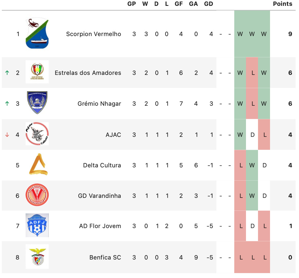 Last year’s winner, Scorpion Vermelho, keep their place at the top of the table while Benfica SC continue to struggle.